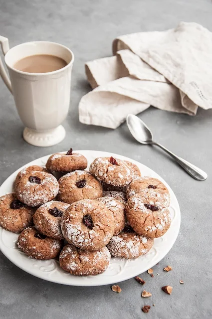 Ciasta mielonych migdałów z żurawiną. Zaraz po wyjęciu z piekarnika są mięciutkie, ale z czasem robią się twarde. Na drugi dzień są w środku lekko ciągnące.